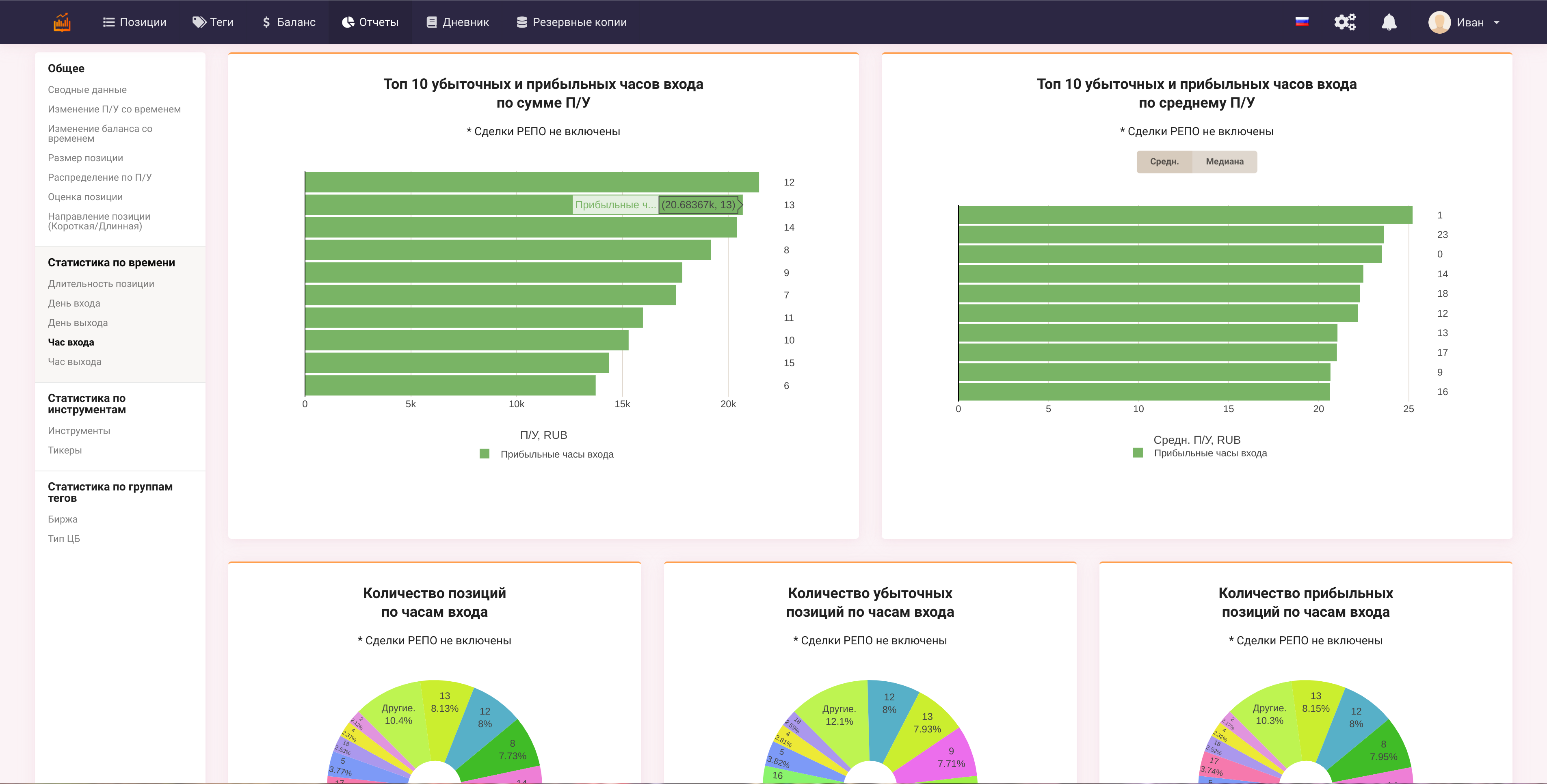 Сводные данные, Изменение П/У со временем, Изменение профит фактора со временем, Изменение баланса со временем, Размер позиции, Распределение по П/У, Тикеры, Отчеты по стандартным группам тегов (Биржа, Тип ЦБ) |