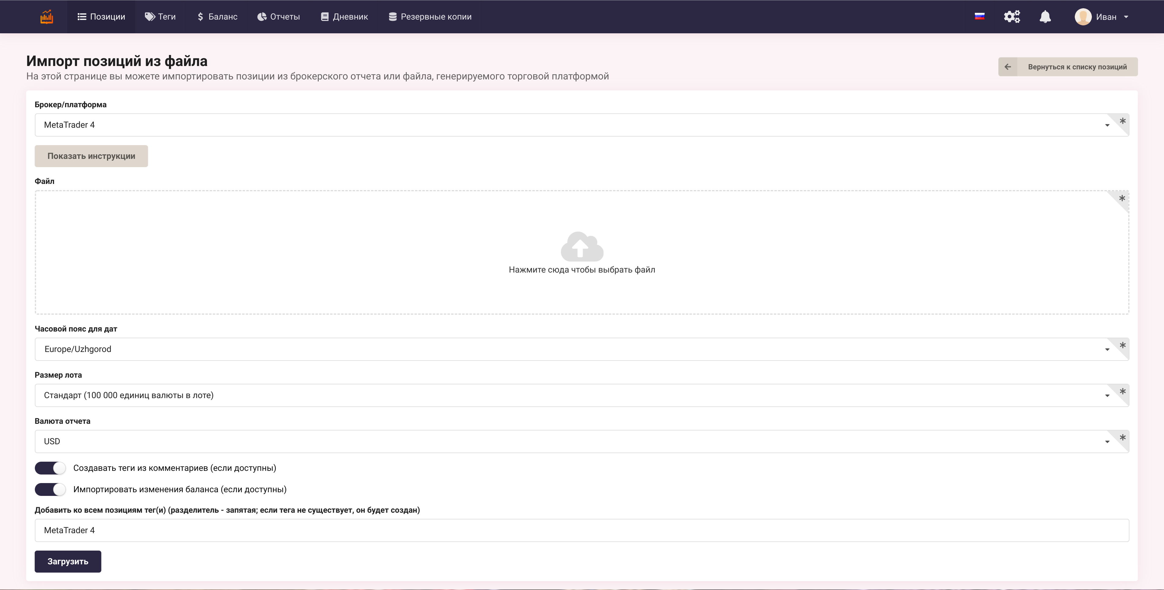 На момент 2021-02-26 поддерживаются следующие брокеры и платформы: Альфа-Банк (Брокерский отчет в Excel), MetaTrader 4 (история в формате html), MetaTrader 5 (Отчет торговой истории в формате Excel), TSLab (в формате CSV), Финам (Справка по счету в формате HTML), TEFS, Ай Ти Инвест, Открытие (срочный рынок, в формате XML), Сбербанк (в формате xlsx), Тинькофф Банк (в формате xlsx), TigerTrade (CSV), NinjaTrader:позиции (Excel), Церих (HTML), Tradovate (CSV), БКС (Excel), ВТБ (ПАО) за период (Excel), Interactive Brokers Central Europe (HTML). Актуальный список можно видеть в приложении на странице импорта. Новые брокеры и платформы добавляются по необходимости. Также можно вручную сформировать Excel-документ в нашем собственном формате или добавлять сделки по одной вручную.